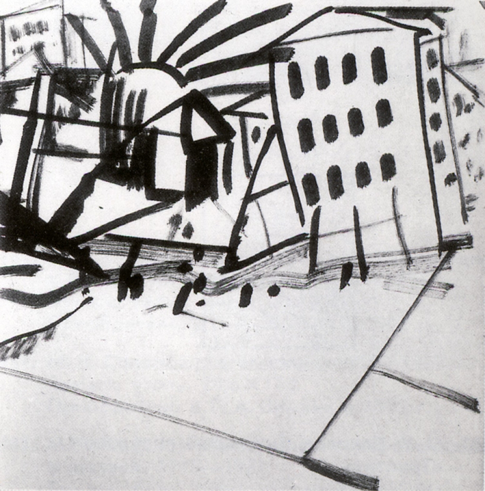 Название: Городской пейзаж. Площадь Дата: 1919-1920 Размеры: 17.5см x 17.5см Техника: бумага, тушь, кисть Ключевые слова:город, городской пейзаж, площадь